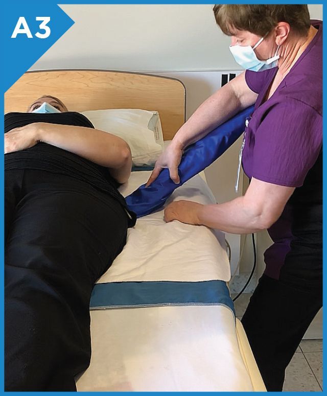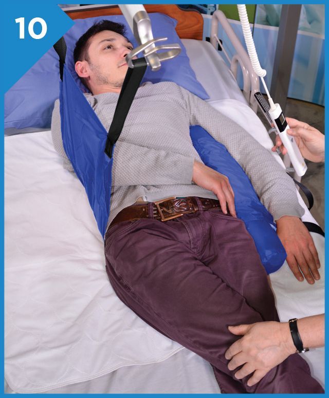 Or on the outside of the arm when the sling is placed a bit higher. Leave about à 5” space between the patient and foam stopper, the patient will begin to turn before the stopper leans against the body and reduce the chances of sliding underneath.
