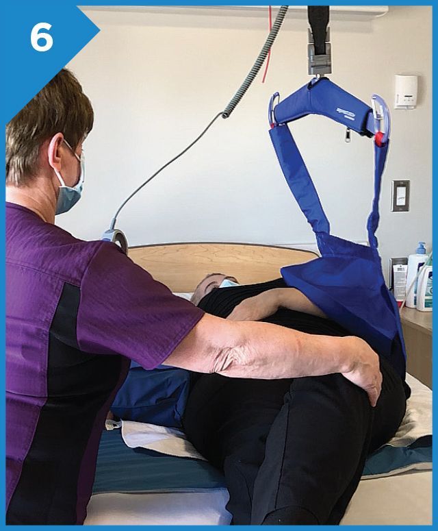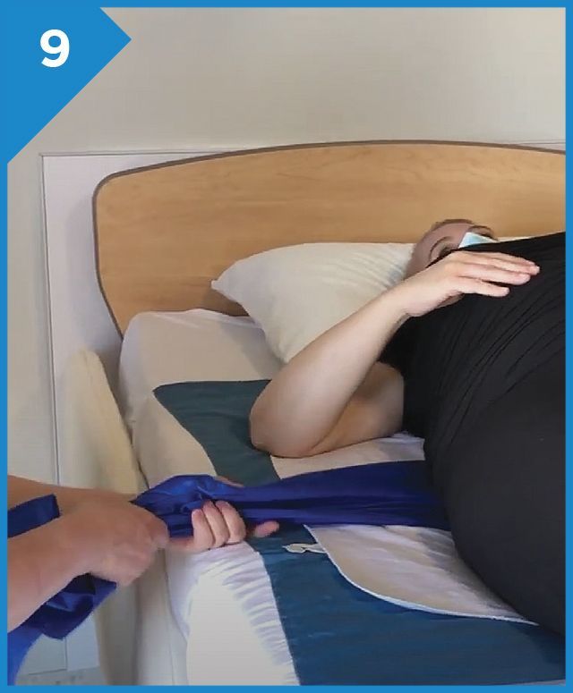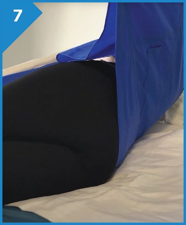 While the sling is being lifted pull on the patient’s crossed over leg until it reaches the side of the bed.