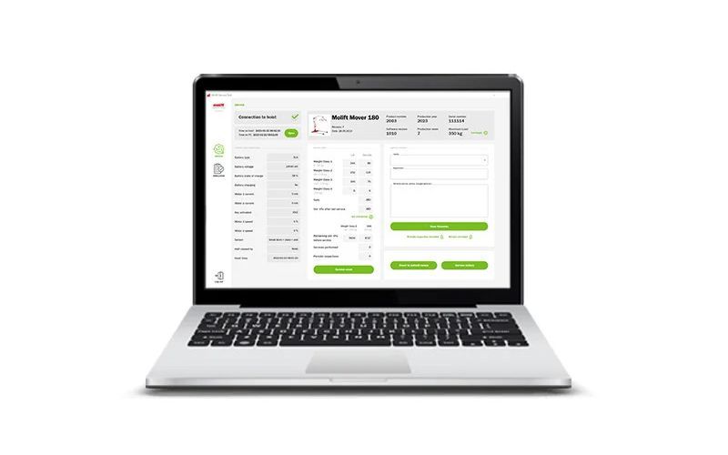 | 6 | 35 | Aluminium, Plastic, Steel | 451 | Chassis,column, leg support, control panel, hand control, lifting arm, battery and integrated charger | 100 hoists at: 165lbs. | Molift Service Tool | 619 |