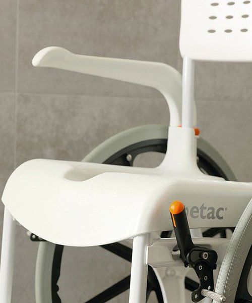 The Etac Clean 24-inch wheels are positioned to make it easy to manoeuvre the chair without compromising user safety or comfort. It is easy to transfer to and from the chair thanks to the large, unrestricted seat in front of the wheels. The brake handles are also positioned below the seat so that they do not get in the way during transfer, while remaining easy to reach.